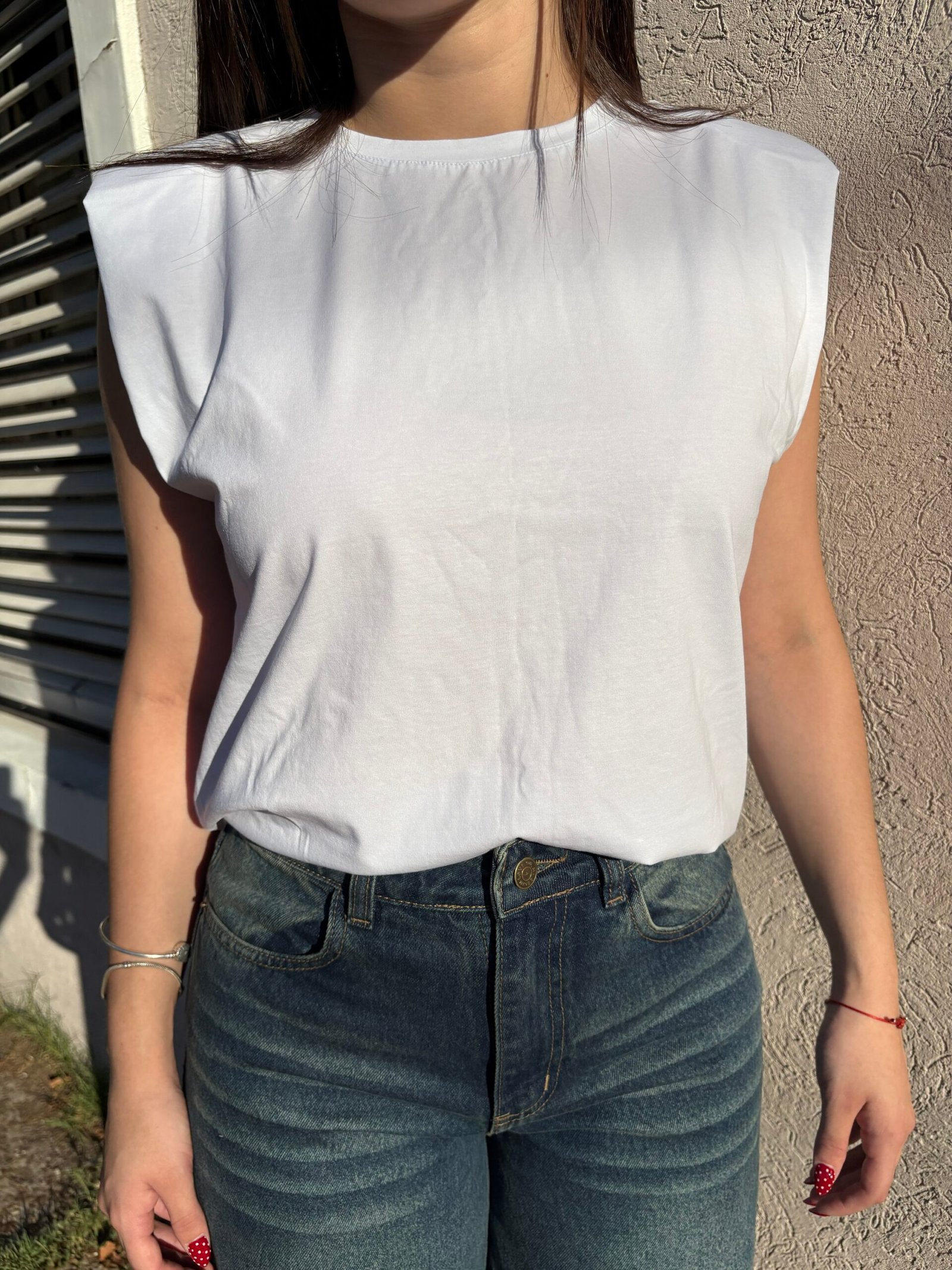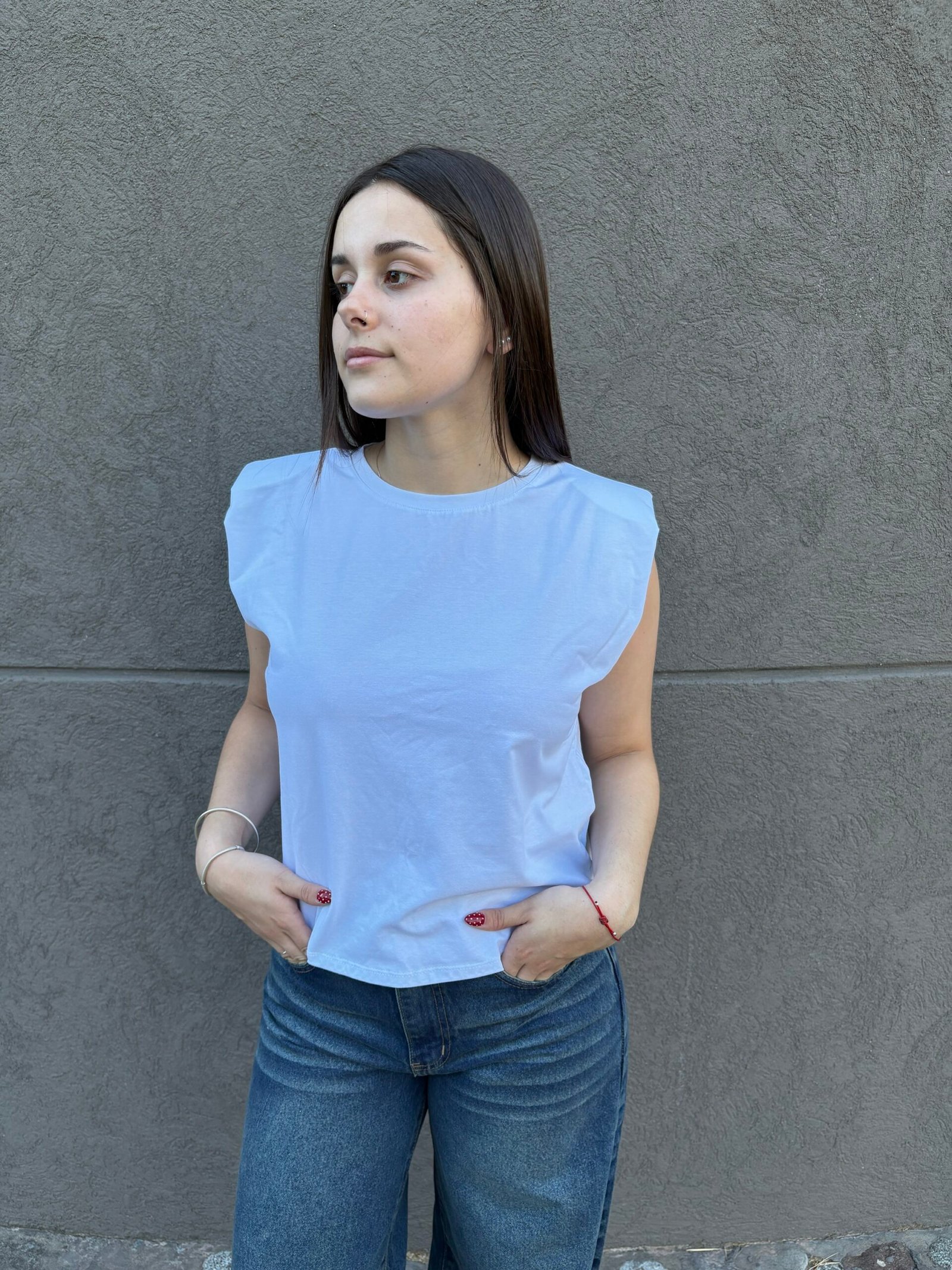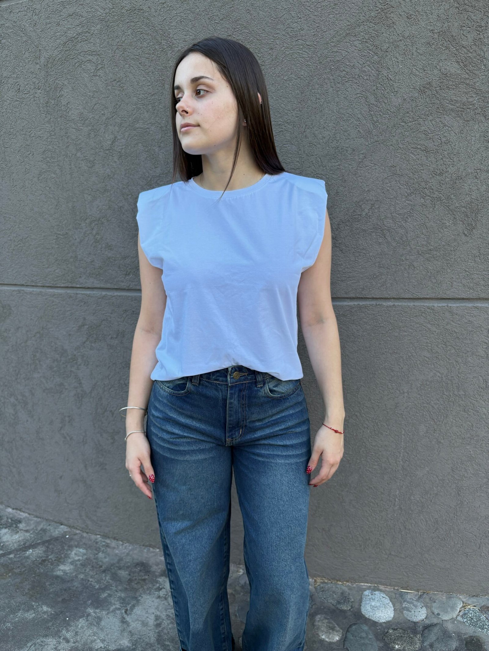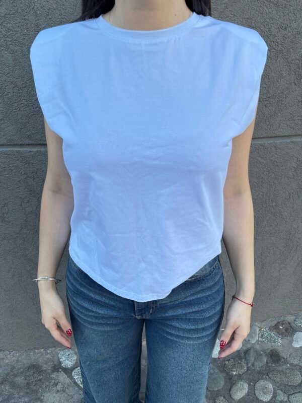 Remera femenina de estilo urbano, confeccionada en algodón con hombreras internas que aportan estructura en los hombros.