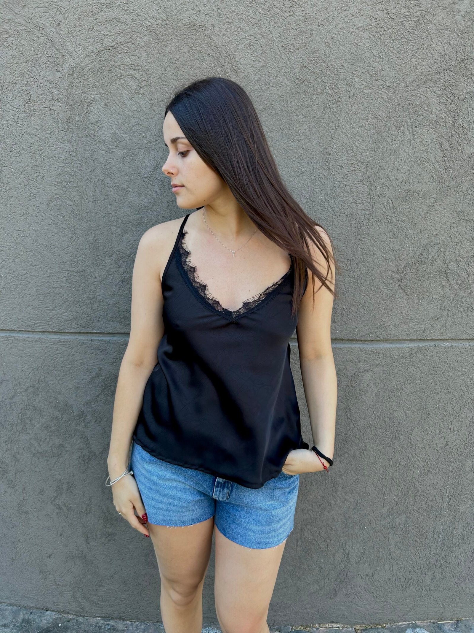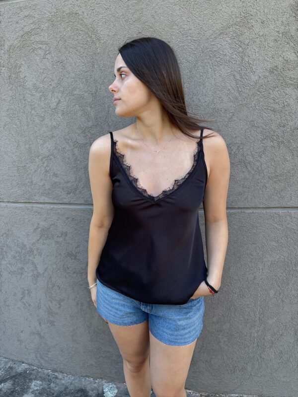 Musculosa femenina estilo lencero, confeccionada en tela satinada con terminación de encaje en el escote.
