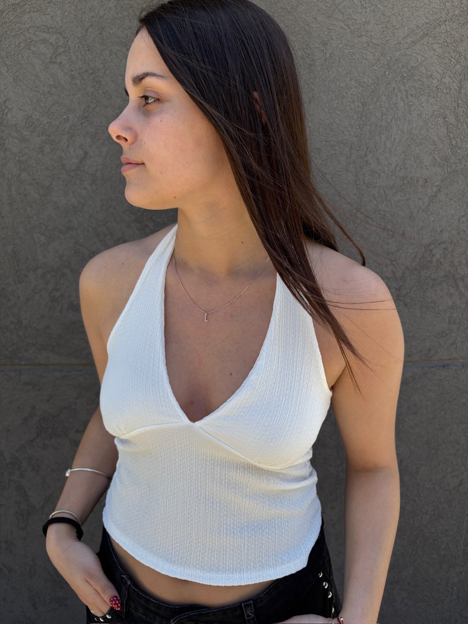 Top femenino estilo halter, confeccionado en tejido morley con textura suave y escote en V.